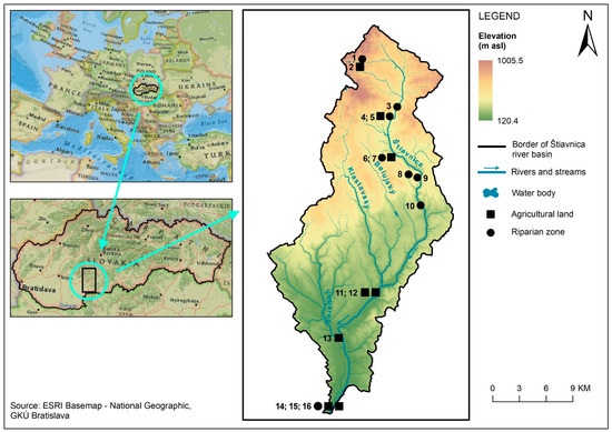 The study was carried out in Slovakia on the 55 km long Štiavnica River floodplain. We selected 16 localities of which 8 localities were agricultural land (3 of them used as grasslands and 5 used as arable land), and 8 localities were part of riparian zones (Figure 1). The river flows through the Štiavnické vrchy Mountains of volcanic origin and the Podunajská pahorkatina Hills. The Štiavnické vrchy Mountains are managed as protected areas, the Podunajská pahorkatina Hills are used intensively for agriculture. The lowest locality is located at 123 m above sea level and the highest locality is 648 m above sea level. Due to such a difference in altitude, the watercourse is on the boundary of the Cfb/Dfb regions [31] (using the Köppen climate classification) characterized by a temperate/continental climate. The warm temperate and humid zone Cfb occurred in the Southwestern part of Slovakia with the lowest altitudes. The temperate and humid zone Dfb is located further north at higher altitudes. An average annual precipitation ranges from 584 (the lower part of the river) to 794 (the upper part of the river) mm. An average annual temperature ranges from 7 °C (the upper part of the river) to 10.2 °C (the lower part of the river). Soils are classified as Fluvisol according to the World Reference Base for Soil Resources. Fluvisols developed on fluvial deposits have weak horizon differentiation but distinct 10–25 cm thick topsoil horizons (A horizon) followed by the A/C and C horizon as parent material.