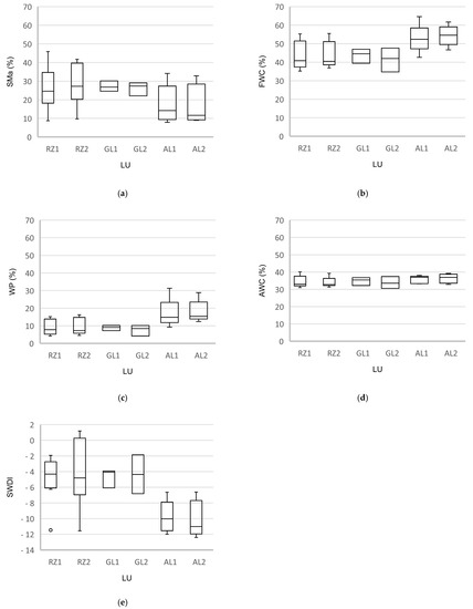 The soil hydrological properties were estimated along the Štiavnica River for three different ecosystems (RZ, GL, AL) in both soil layers. The median values of the estimated FWC (Figure 2b), WP (Figure 2c), and AWC (Figure 2d) were lowest in the RZ localities followed by the GL and AL localities. The median SMa (Figure 2a) was highest in the RZ localities in the second soil layer with very similar values in the RZ localities followed by the AL localities. Similarly, AL localities reached the lowest values for SWDI (Figure 2e).