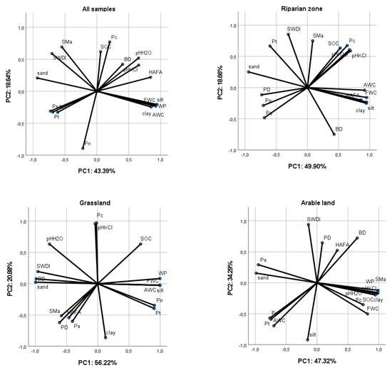The texture of the soil and the content of organic matter play an important role in the physical and hydrological properties of the soil [48]. We found correlations between hydrological parameters and selected soil characteristics. The proportion of sand, silt, and clay and the amount of organic matter present in the soil is important [49,50]. The textural composition differed strongly between the localities, and the clay content varied between 4.25 and 42.28%. The SOC content was generally higher for topsoil (from 10.65 to 30.60 g kg−1) than for subsoil (from 9.00 to 22.95 g kg−1). The combination of soil organic matter amount with soil texture affects the bound water held in soil matrix either via electrostatic forces at adsorption sites and/or surface tension (capillary forces) in soil pores.