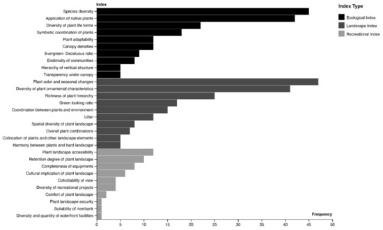 According to the classification and summarization of the evaluation indicators in the 93 related studies, this research generated 10 indicators associated with “Ecological Capacity”, 10 indicators associated with “Landscape Aesthetics” and 10 indicators associated with “Social Service”, (Figure 1). These 30 indicators were submitted to expert review and were used to generate evaluation indicators for the proposed evaluation model.