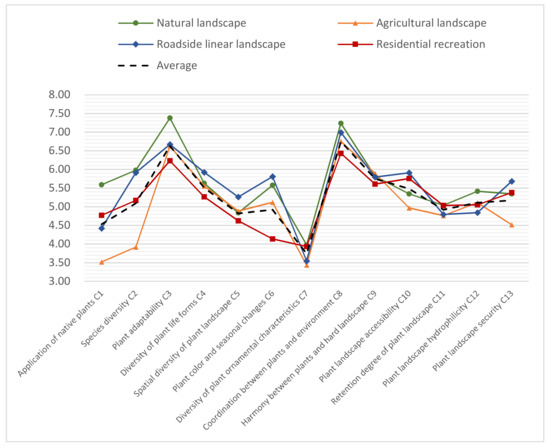 Finally, the analysis of the 13 indicator layers and the average CEI levels of the four types of landscape showed the highest scores for C8 (coordination between plants and surrounding environment) and C3 (plant adaptability) and, in general, the lowest scores for C7 (diversity of plant ornamental characteristics) and C5 (spatial diversity of plants). The natural landscape had obvious advantages over the other three types in terms of the three ecological benefit indicators of C1, C2, and C3, and its scores for other indicators were also better than the overall average value. The roadside linear landscape was relatively good in C6 (color and seasonal change) and C13 (safety) but was defective in C12 (hydrophilicity). The overall evaluation value of agricultural landscape was low, and its scores for C1, C2, C10, and C13 were far lower than those of other types of landscape (Figure 2).