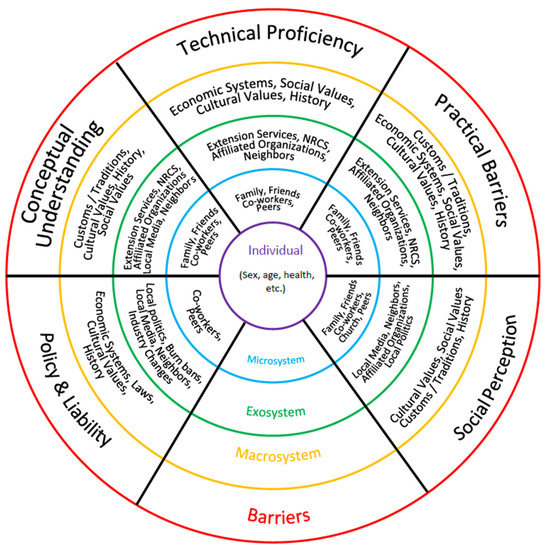 Barriers can extend across scales: for example, an individual could feel that their local community (microsystem), other potential fire practitioners (exosystem), and the other members of their state or country (macrosystem) have a negative perception of prescribed fire, which limits their own use of this land management tool. Alternatively, barriers can exist at individual levels such as a countywide burn ban (exosystem) limiting a potential fire practitioner. Understanding the scale at which a specific barrier occurs is imperative for selecting and applying effective solutions that address that barrier. Otherwise, intended solutions risk being redundant or irrelevant if they fail to focus on the scale at which the barrier occurs.