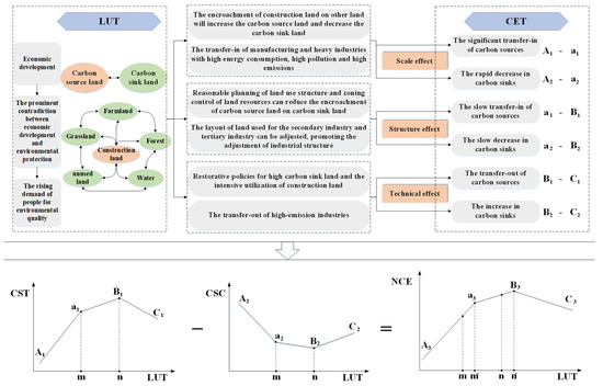 Theoretical analysis of the relationship between LUT and CET (CSC: carbon sink changes; CST: carbon source transfer; NCE: net carbon emissions).