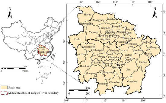The Middle Reaches of the Yangtze River in China include Hubei, Hunan, and Jiangxi provinces (Figure 3). The total land area is 564,100 km2. In 2021, the total economic volume reached 12.57 trillion CNY. With the ‘Rise of Central China’, ‘Yangtze River Economic Belt’, and other key national strategies in China, this region has become an important growth pole for China’s economic development. The Middle Reaches of the Yangtze River includes the Wuhan-centered urban agglomeration (involving nine cities), Changsha-centered Chang-Zhu-Tan urban agglomeration (involving eight cities), and Nanchang-centered Poyang Lake urban agglomeration (involving eight cities). In the past 20 years, China’s labor-intensive and energy-intensive industries have shifted from coastal areas to central and western regions, and the Middle Reaches of the Yangtze River has undertaken a large number of industries with high energy consumption, high pollution, and high emissions. Moreover, the land use in this region has undergone profound transformation, resulting in prominent ecological and environmental problems, and CET has become a restrictive factor for sustainable development. In this context, this paper takes the Middle Reaches of the Yangtze River as the research area to explore the relationship between LUT and CET to guide the low-carbon transition of land use.