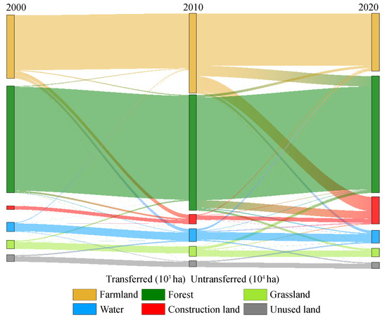 During the whole study period, the farmland is mainly converted to construction land, forest, and water, and the transfer-out area significantly increases from 2010 to 2020. From 2010 to 2020, the area converted to construction land is 3.57-folds, the area converted to forest is 11.82-folds, and the area converted to water was less relative to those in 2000–2010. In the whole period, the forest is mainly converted into construction land and farmland. Similarly, the transferred-out area of the forest from 2010 to 2020 was significantly larger than that from 2000 to 2010. Notably, the farmland contributes 74.18% to the forest and is the main reason for the change in the forest from transfer-out to transfer-in. The construction land is always dominated by transfer-in, and the farmland has a contribution rate of 66.57% and 60.64% in the two stages, respectively. Therefore, in the process of the LUT, the farmland is the main contributor to the construction land and forest with a contribution rate exceeding 60%.