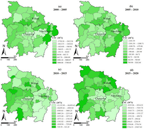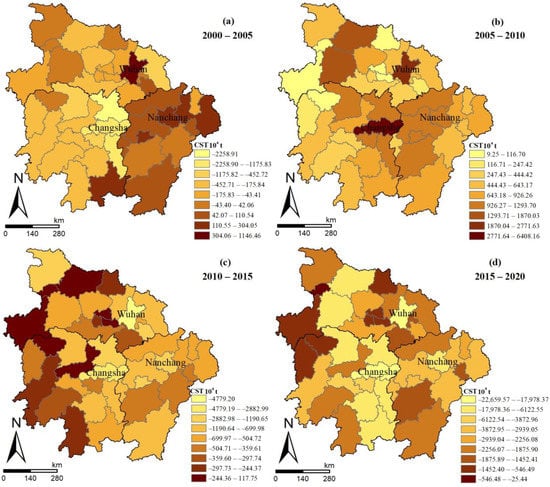 According to Formulas (2) and (3), we obtain the changes in the carbon sinks in the Middle Reaches of the Yangtze River (Figure 5). As a whole, the phase characteristic of the carbon sink changes shows an N-type pattern of intensification–moderation–reintensification–remoderation. The east and south first show an increase and then a decrease, while the west and north first exhibit a decrease and then an increase. From 2000 to 2005, Nanchang has the largest decrease in carbon sinks (37.301 million t); from 2005 to 2010, Changsha has the most significant decrease in carbon sinks (21.0139 million t); and from 2010 to 2015, the largest decrease in carbon sinks occurs in Wuhan (31.302 million t). The significant decreases in the carbon sinks in Wuhan, Changsha, and Nanchang are related to the fact that they are the development centers of the Wuhan urban agglomeration, the Chang-Zhu-Tan urban agglomeration, and the urban agglomeration around the Poyang Lake, respectively.