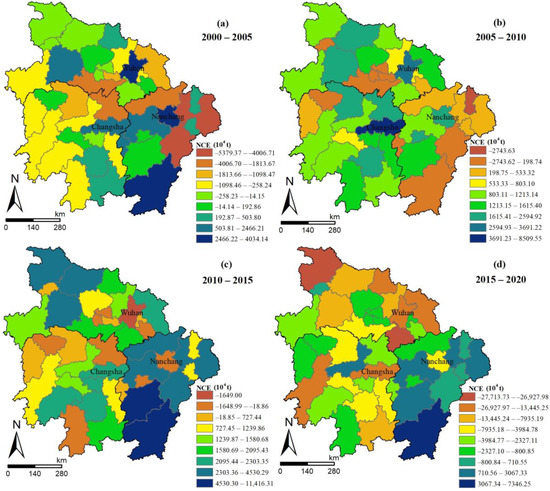 According to Formula (10), we obtain the changes in the net carbon emissions in the Middle Reaches of the Yangtze River (Figure 7). From 2000 to 2020, the changes in the net carbon emissions in the Middle Reaches of the Yangtze River show significant heterogeneity in different regions and different periods. The urban agglomeration area with Wuhan–Changsha–Nanchang as the core shows an increasing trend in net carbon emissions before 2010, and a decreasing trend after 2010, while it is the opposite case for the non-urban agglomeration area. This feature is similar to that of the carbon source transfer, indicating that the increase in the carbon sinks in the Middle Reaches of the Yangtze River is far from enough to offset the transfer-in of the carbon sources.