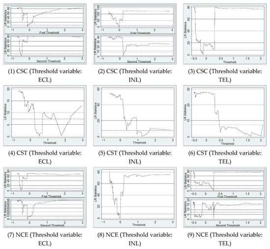 Furthermore, we plot the threshold parameter versus the likelihood ratio (LR) statistics to verify the robustness of the threshold regression model. In Figure 8, the dotted line represents the critical value at the 95% confidence level; the LR curve below the critical value indicates the confidence interval of the threshold value; and the threshold value is the minimum value of the LR curve within the confidence interval. The results in Figure 8 are consistent with the significant results in Table 5, indicating that the results of the threshold regression model are relatively robust.
