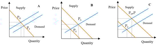 Bryan [] pointed out that, in microeconomics, the basic model of the supply and demand curve mirrors the functional relationship among three variables, namely, price, demand, and supply, from a mathematical perspective. The theoretical basis is that price is an independent variable that determines demand and supply and is positively correlated with supply but negatively correlated with demand. Equilibrium price is produced when supply and demand are balanced. The relationship between supply and demand can predict the quantities of supply and demand caused by price change. The price can also be affected by supply and demand (expressed as value in this study). According to the equilibrium price principle of supply and demand in economics, this paper analyzes the influence mechanism of the temporal change in the supply and demand of ESV on the supply and demand curve of ESV (simplified as a straight line in this paper). Generally, with social and economic development, the regional demand for ES will increase (Figure 3A), while the supply of ES will decrease (Figure 3B). The above two occur simultaneously (Figure 3C), resulting in an increase in the scarcity (value) of ES. Scholars [] once pointed out that, with the passage of time, the natural environment would become an irreplaceable value-added asset, indicating that the supply and demand of ES will change over time, thus affecting the value of ES and changing the importance (scarcity) of ES.