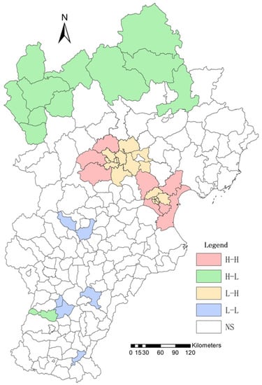 The ES supply was calculated using Equation (1), and the ES demand was evaluated using Equation (2). The spatial correlation between supply and demand of ES was determined through bivariate spatial autocorrelation analysis. Using ESV and the ecosystem service demand index as variables, the local spatial autocorrelation (LISA) aggregation map of the two variables was plotted. The supply and demand of ecosystem services in the BTH region were divided into five categories, namely, high–high (H–H)/low–low (L–L) significant positive spatial correlation, low–high (L–H)/high–low (H–L) significant negative spatial correlation, and no significant spatial correlation (NS). As shown in Figure 4, H–H region was mainly distributed in the suburbs of Beijing and Tianjin, with the H–L region in the northern BTH, L–H region in the main urban areas of Beijing and Tianjin, L–L region mainly distributed sporadically in the southern BTH, and NS region the most widely distributed.