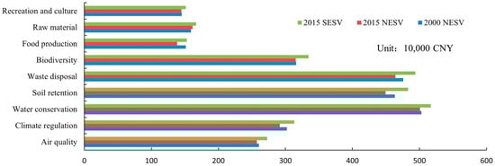 Figure 5 shows the changing trend of NESV and SESV in the BTH region. As can be seen from the figure, the NESV in the BTH region was 2775.54 billion CNY in 2000, and it decreased to 2722.44 billion CNY in 2015. Considering the changes in supply and demand, the SESV in 2015 was 2884.85 billion CNY. In terms of types, the NESV in 2000 ranked as follows: water conservation > waste disposal > soil conservation > biodiversity > climate regulation > air quality > raw materials > food production > recreation and culture. In 2015, the NESV decreased by 53.07 billion CNY, among which food production had the highest reduction ratio, followed by climate regulation, soil conservation, and waste disposal, with a reduction ratio of more than 2%. The reduction ratios of recreation and culture, biodiversity, and water conservation value were relatively low, while that of raw materials increased to some extent. However, the SESV in 2015 was 109.34 billion CNY higher than the NESV in 2000 and 162.41 billion CNY higher than the NESV in 2015.