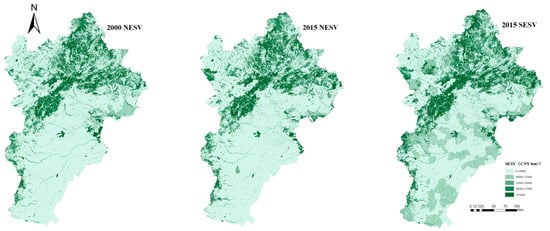 NESV of individual ES in 2000 and 2015 and SESV in 2015 in the BTH region.
