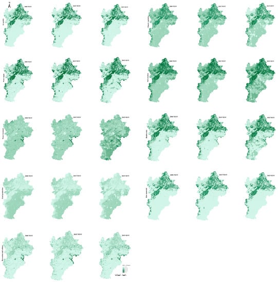 The ES equivalent factors table in China proposed by Xie Gaodi was adopted in this study []. According to the national average grain price ratio, the value was revised to that of 2015, and the value level was further corrected from the whole country to the BTH region [] using the NPP comparison method, so as to determine the NESV of each land-use type (Table 1). Combined with land-use data in the BTH region, the NESV was calculated using Equation (1).