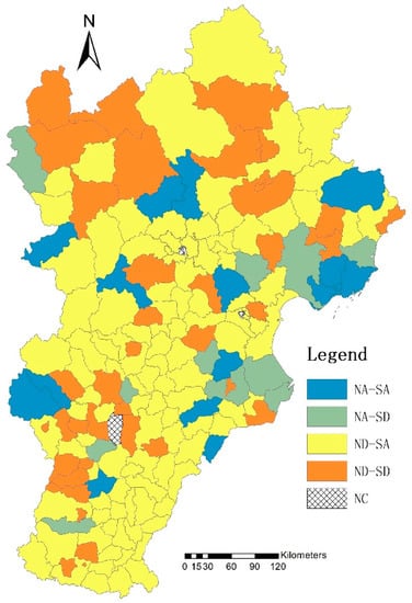 In order to fully understand that changes in regional ecosystem service, it is of great importance to calculate the changes in NESV and SESV in the BTH region while using the country as the evaluation unit. The ecological zoning was divided into five categories, namely, NESV increase–SESV increase (NA–SA), NESV increase–SESV decrease (NA–SD), NESV decrease–SESV increase (ND–SA), NESV decrease–SESV decrease (ND–SD), and no change, as shown in Figure 8. NA–SA areas were scattered in the BTH region, with increased NESV and improved ecological environment. At the same time, the demand and SESV of regional ecosystem increased, which represented benign development. However, it is still important to further optimize the land-use structure, improve supply capacity, and promote the coordinated development of supply and demand. The NA–SD area was mainly distributed in the eastern coastal area, which was in a relatively good state because of improved NESV, increased supply, reduced demand and SESV, and improved regional ecological environment. The ND–SA region was the most widely distributed. The baseline value in the region decreased; however, with economic development and population growth, ecological demand and the SESV increased, especially in the districts and counties around Beijing, Tianjin, Shijiazhuang, and Baoding, where the NESV obviously decreased, while the SESV increased. This represented the core area of economic development in the BTH region. Therefore, it is necessary to attach great importance to land control, limit the conversion from land with high ESV to land with low ESV, and improve the utilization rate of ES. The ND–SD region was mainly distributed in the northern ecological conservation and sporadically in the southern plain. The NESV and SESV were reduced in this region, as were the overall ecological environment quality, regional demand, and SESV. Hence, it is necessary to optimize land-use structure in this region and promote the coordinated development of ecological environment and economy.