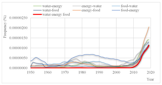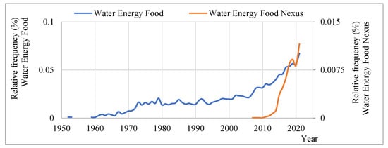 Currently, humanity is facing a major challenge: the rapidly growing demand for WEF. Population growth, the different ways of life of each society, and the urgent need to improve WEF security for the poorest are putting increasing pressure on resources [7]. Unless there are significant changes in production and consumption patterns, if we would like to support the rate of growth and current way of living, agricultural production should increase by about 60% until 2050, and global electricity production is projected to increase by about 60% over the next ten years [8,9]. Thus, a careful management of the WEF nexus is required. This fact has emerged in the literature over the last 10 years (Figure 1 and Figure 2) [10,11,12,13,14,15,16,17,18,19].