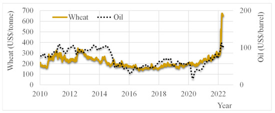 Prices of wheat (data from [82]) and oil (data from [83]) (January 2010, June 2022).