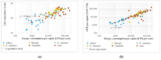 Even if the causal link of energy consumption to GDP and life expectancy is questionable according to some researchers, by correlating recent global data on the current energy consumption with GDP per capita and life expectancy, we identify interesting trends (Figure 6a,b).