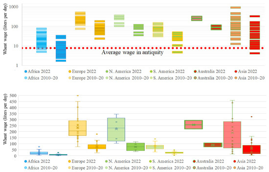 Average wages in different countries (data from [108]) converted to wheat wages. 2016: wheat price average of 2010–2020 was about 210 € per ton; 2022: wheat price was about 650 € per ton. Data accuracy is low as prices depend on local markets. Top: plot in logarithmic scale indicating the average wage in antiquity (e.g., what we used to consider as extreme poverty); bottom: box plot.