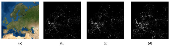 (a) Europe in Mercator projection. Night lights of Europe in Mercator projection: (b) 1992; (c) 2002; (d) 2012 [2,155].