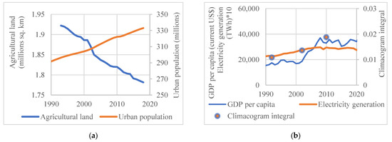 EU (1990–2020) (a) Agricultural land (data from [156]) and urban population (data from [157]); (b) GDP per capita (data from [158]), electricity generation (data from [106]), and clustering indicator (Climacogram integral).
