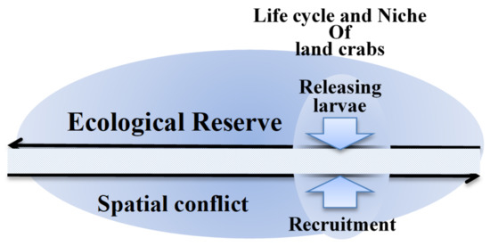 However, from the qualitative point of view of island geography, food and niche are also factors that affect species diversity, but related research on land crabs is still lacking. Therefore, the aim of this study is to combine the structure of life cycles and niche from a geographic perspective and to explain how the existing spatial configuration affects the deterioration of coastal ecosystems. Spatial analysis of land-marine integration can contribute to integrative thinking.