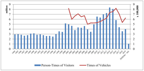 Visitor and vehicle numbers in Kenting National Park from 1983 to 2020 (January–July) and 2001 to 2019. (Note: data from https://www.ktnp.gov.tw/ (accessed on 8 August 2022), and Ministry of the Interior, R.O.C. (Taiwan) (accessed on 8 August 2022)).