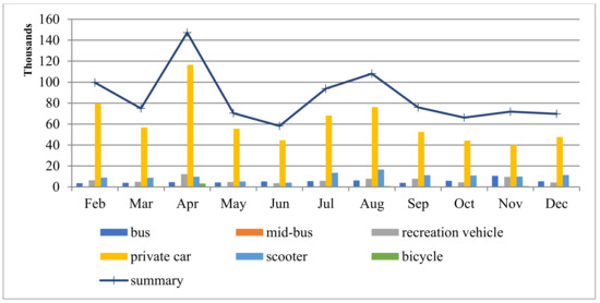 Kenting National Park is an international tourist hotspot because of its tropical landscape conditions, attracting more than 4 million visitors a year since 2000 and 8.3 million in 2014 alone, with an average annual traffic volume of about 630,000 vehicles (includes buses, vans, sedans, and motorcycles) (Figure 4). The main means of transport are private cars and motorcycles, and the only way to get around is the TPH 26. According to the report in 2010 and 2011, April (spring music festival) and July–September (summer vacation) are peak periods for tourists and traffic in Kenting National Park (Figure 5) [61,62]. The larvae release period of female crabs is from May to September (the start time depends on the rainy season) [43]. It shows that the peak traffic period and the larvae release period highly overlap.