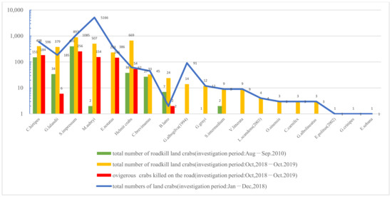 Comparison of land crab road kills in 2010 and 2019 (Note: data from [51,52]).