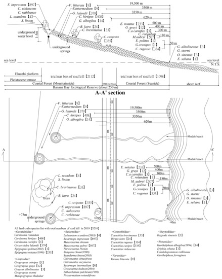 In terms of climate, Banana Bay belongs to the tropical monsoon climate zone, and the temperature and rainfall are similar to those of tropical rain forests [20]. In terms of topography, the northern section is a cliff topography, composed of uplifted high-level coral reefs. In the whole area, there are many large coral reefs that have collapsed or remnants, and the terrain is rugged. The southern section is the fringing reef terrain of the sea grooves, and between the sea grooves, there are coral skeletons, reef gravel and coarse-grained shell sand. Geologically, Banana Bay Ecological Reserve is located in a low-lying tectonic zone, a high-permeability sand dune cover, and a porous coral reef [54]. The bioclastic layer in the reserve provides a good living environment for land crabs, with caves for easy hiding. The protected area is located on the Hengchun Peninsula, at the junction of the Eurasian plate and the Philippine Sea plate. The continuous change in coral reef has, at different times, had different effects on the sea surface stagnation and plate extrusion caused by the sea formation platform, as we can observed from the profile map (Figure 3). The beach sand layer, bioclastic debris, and biodebris sedimentary surface layer are covered in turn [58].