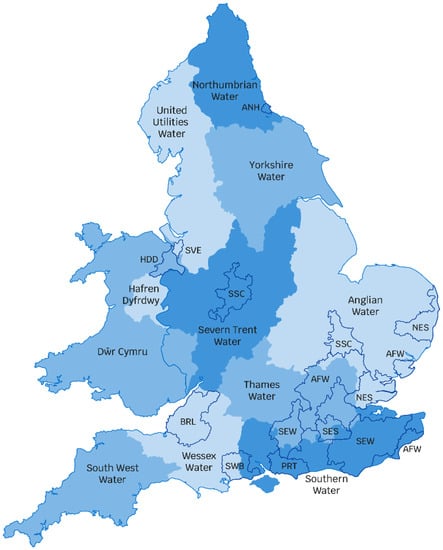 - Ofwat. Water Companies in England and Wales. Available online: https://www.ofwat.gov.uk/households/your-water-company/contact-companies/ (accessed on 9 July 2022).