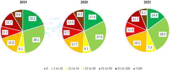 Annual spill profiles (all WaSC data combined) are presented in Figure 2. The percentages of the total number of SOs across all WaSCs combined spilling ≤10 times over each year were as follows: 2019: 48.3%; 2020: 44.9% and 2021: 43.4%. These results suggest a slight deterioration in spill performance over the assessment period, however, this apparent deterioration was not found statistically significant either across all WaSCs (Q = 0.29, p = 0.87) or by WaSC (p > 0.10). It is important to note that the number of SOs reported with a shellfish waters EDM requirement differed considerably between WaSCs (ranging from 37 in the Wessex Water region to 373 in the South West Water region; based on 2021 figures) and therefore some companies have significantly more of a shellfish waters SO ‘burden’ than others. Nevertheless, the data show that the performance of SOs in England is, in many cases, falling short of that expected by the EA discharge consenting policy.