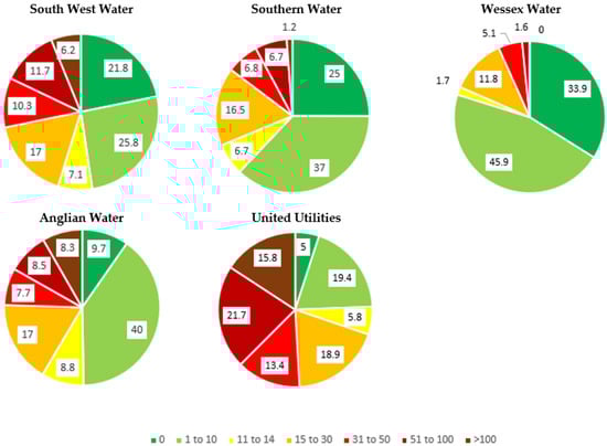 The SO spill performance was found to differ significantly between WasSCs each year at the 5% significance level (2019: Q = 14.16, p = 0.028; 2020: Q = 20.31, p = 0.002; 2021: Q = 19.38, p = 0.004) and across all years (Q = 23.54, p = 9.86 × 10−5), with Wessex and Anglian Water having a statistically significant different SO spill performance than South West Water and United Utilities (i.e., generally performed better against the 10 spill standard) (p < 0.039). Averaged over the 3 years for each of the five WaSCs, the seven spill categories used in our study are shown in Figure 3. The ‘1–10 spills’ category is the most common category for all WaSCs. We identified a difference in spill performance across the WaSCs with United Utilities showing the widest range of spills and the highest spilling SOs overall. Wessex Water, with the lowest number of shellfish water SOs, returned the best performance overall with 79.8% of SOs spilling ≤10 times over the monitoring period. In general, the west of the country received more rainfall than the east over the 2019 to 2021 period [34]. The north west region in particular (served by United Utilities) consistently received above average rainfall during the monitoring period. This may at least partly explain the higher number of spills from SOs within this WaSC’s network. However, the WaSC in the driest region (Anglian Water) was not the best performing company. Consequently, factors other than rainfall confound these results.