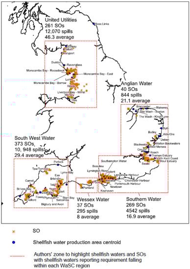 Storm overflow permitting and performance measures have been thoroughly discussed in the peer reviewed literature [21,22,23]. Specifically, these have covered issues such as the need for introduction of telemetry for flow measurement (spill event duration monitoring) to assess SO performance along with discussion of the methods of permitting of SOs across Europe which are generally based on spill frequency. The public health impacts of SOs have recently been reported [24]. As the reporting and publishing of spill data from SOs is a relatively new requirement, there is currently little in the peer reviewed published literature on the status of their performance. The UK Government’s appointed regulator for the WaSCs acknowledges that the current level of spills from SOs is unacceptable [25]. A recent study applied machine learning to wastewater treatment plant flow, rainfall and telemetry alarm data and detected additional storm tank overflows to those that had been detected by EDM [26]. A report by WWF in 2017 highlighted the poor ecological status of many UK rivers and the contribution of SOs to this situation [27]. There have been various reports more recently in the media on SO spill performance, noting the large number and duration of spills. We are not, however, aware of reports of SO discharge performance specifically in relation to the 10 spills design criterion used for shellfish water impact assessments. In this study, we analysed publicly available data to investigate SO spill performance for assets impacting on shellfish waters in England. The spill data that we reviewed were recorded by event duration monitors distributed in areas serviced by five WaSCs i.e., all those WaSCs with SOs impacting shellfish waters. Our specific objectives were to determine if spill performance is meeting the 10 spills standard; if performance differs between WaSCs and if the performance observed (as judged by spill numbers) is of concern regarding shellfish water quality.