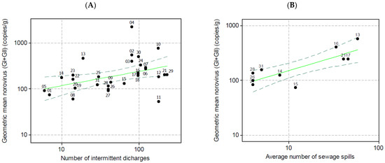 Linear relationships between mean concentrations of norovirus and the number of storm overflows (A) (log10geometric mean NoV = 1.758 + 0.3120 ∗ log10 number of discharges; p < 0.019; R2adj = 15%)/average number of spills (B) (log10geometric mean NoV = 1.688 + 0.4904 ∗ log10 average number of spills; p < 0.001; R2adj = 62%). Reproduced from Campos (2015) [45]. Numbers above black dots identify sampling sites as defined in Campos (2015). Continuous green lines represent linear regressions. Dashed green lines represent 95% confidence intervals.