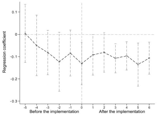 The dynamic impact of the high-standard farmland construction policy on the incidence of rural poverty is shown in Figure 5 and Table 3. Figure 5 shows that after implementation (i.e., 2011), the 90% confidence interval of the regression coefficient is below 0, which shows that it has indeed inhibited agricultural poverty. Through the regression coefficients reported in Table 3, it can be seen that the estimated coefficients for the year of policy implementation (i.e., 2011) is significantly negative at −0.131; this shows that since the implementation of policies in 2011, the high-standard farmland construction policy has played a role in poverty reduction; with the gradual expansion of the construction scale of high-standard farmland, the estimated coefficients reach their lowest value (−0.136) in 2016, which suggests that policy’s poverty reduction effects are stable and sustainable.
