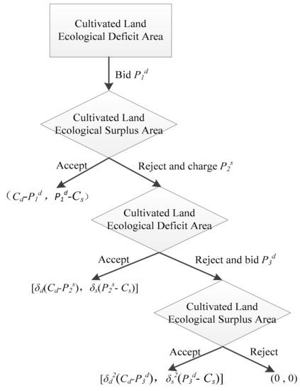 (2) Regarding the cultivated land area, in order to safeguard their interests, those in the ecological surplus area will take the initiative to negotiate with those in the cultivated land ecological deficit area, and those in the deficit area are willing to assume the responsibilities and disclose the compensation information for the surplus area so as to promote the interregional compensation policy established by the central government. Therefore, it is assumed that those in the ecological deficit area of cultivated land give the first bid in the game at the beginning.
