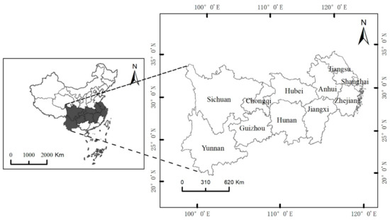 The Yangtze River Economic Belt is a national strategy as important as the “Belt and Road”, the “Coordinated Development of Beijing-Tianjin-Hebei”, and the “Construction of the Guangdong-Hong Kong-Macao Greater Bay Area”, which covers 11 provinces (cities), including Chongqing, Sichuan, Yunnan, Guizhou, Jiangxi, Hubei, Hunan, Jiangsu, Zhejiang, Anhui, and Shanghai (Figure 2). As of 2018, the cultivated land area of the Yangtze River Economic Belt was 44.99 million hm2, accounting for 33.33% of the total cultivated land area of China, and the total agricultural output value reached CNY 2487.39 billion, accounting for 40.48% of total agricultural output in China, and is one of the fastest-developing regions in China. However, its rapid development is also accompanied by decreased cultivated land quantity and the deterioration of cultivated land quality, which lead to the degradation of the regional ecological environment. In 2016, the Outline of the Yangtze River Economic Belt Development Plan issued by the Central Committee of the Communist Party of China clearly stated that the Yangtze River Economic Belt should be built as a pioneering demonstration belt, an innovation driving belt, and a coordinated developing belt for the construction of China’s ecological civilization. Therefore, in the context of constructing ecological civilization, improving the regional ecological environment, coordinating economic development, protecting arable land resources, and ensuring China’s food and ecological security have become the primary issues of the Yangtze River Economic Belt. This study takes the Yangtze River Economic Belt as the research area and discusses the ecological compensation standards for cultivated land within the region, which has important practical significance for cultivated land protection in the region and the balance of inter-regional development. Meanwhile, the Yangtze River Economic Belt is the ecological economic system of the largest river basin in China. Discussing the ecological compensation standards for cultivated land in the region can also provide a reference for other river basins to explore ecological compensation for cultivated land.