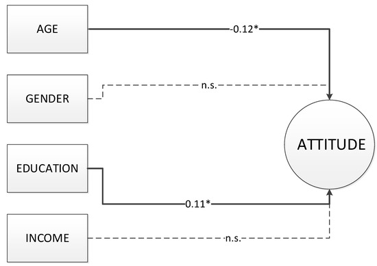 As is seen from the results, the effect of the variables “AGE” and “EDUCATIONAL LEVEL” on the attitude of citizens is statistically significant at a significance level of 10%. The “AGE” variable has a negative effect on the factor of “Attitude,” whereas a positive sign is observed for the independent variable of “EDUCATION.” Goodness-of-fit statistics values are: RMSEA = 0.105; CFI = 0.723.