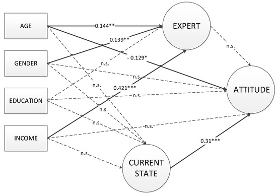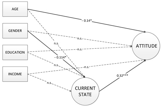 We observe a statistically significant direct effect of “AGE” on the attitude (β = −0.14; p-value < 0.1) and a statistically significant effect of the assessment of the current situation on the attitude (β = 0.32; p-value < 0.01). Goodness-of-fit statistics are: RMSEA = 0.092, CFI = 0.746.