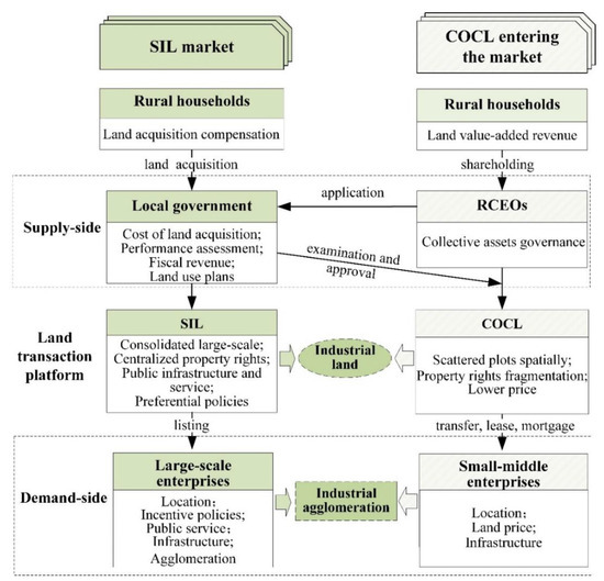 Under competitive market conditions, land transactions and land price depend on the trade-off between the supply of and demand for land resources [23], which are decided by stakeholders’ decision making [6]. The stakeholders, in this study, are the participants of land transactions in the Chinese context, including rural landowners (i.e., rural collectives and rural households), rural collective economic organizations (RCEOs), local governments, and enterprises. A theoretical framework (Figure 1) was developed to analyze the relationship between COCLEM and SIL transactions, including perspectives from both the supply side and demand side.