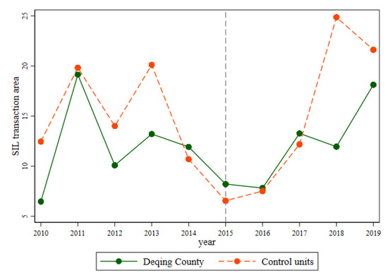 Notes: The vertical line represents the year when the trial of COCLEM was implemented. The red dotted line represents the average SIL transaction area for counties that did not implement COCLEM in Huzhou City.