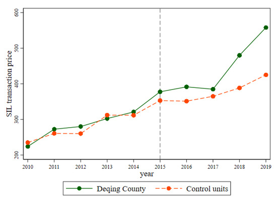 where represents the SIL transaction area (Area) in town in year and represents the trial of COCL entering the market. Both and are dummy variables, since Deqing County has been one of the trials for COCL entering the market since 2015; we suppose in towns that conducted COCLEM in Deqing County and in towns without COCL transactions. Meanwhile, in 2009–2014, , and otherwise. The effect on the average of COCLEM on Area is associated with parameter . Vector refers to control variables influencing Area; and represent individual effects and time-specific effects, respectively; and the remainder error term is [39].