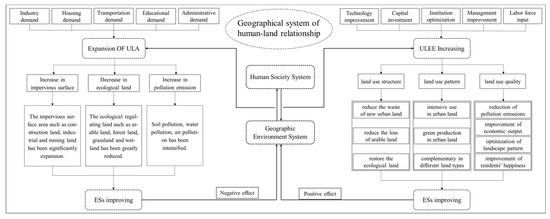 Human society can improve ULEE through technology improvement, capital investment, institution optimisation, management improvement, and labour input [11,14]. On this basis, ULEE influences ESs mainly from three aspects of mediation. First, by optimising land use structure, we can reduce the waste of land in city developments, and effectively transform limited land resources into a supply to meet demand for urban development. Doping so, we can reduce encroachment on arable and ecological land, so that retention of these lands can be maintained or even restored, and their ecological function can be improved [18]. Second, improvement of land use patterns can make urban land use more intensive [21]. More benefits can be generated from less land, while promoting the formation of greener production methods and enabling mutual coordination between different land use types, ultimately reducing negative impact on the ecosystem. Third, by improving land use quality, which includes the reduction of pollution emissions and energy consumption, economic output capacity increases, landscape is optimised, and residents’ happiness is improved [28]. These positive impacts can work together in the environmental system, resulting in sustained improvements in ecosystem services, and in turn supporting the development of human societies, thus achieving harmonisation of human–earth relations. The specific mechanism framework is shown in Figure 1.