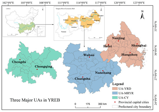 In the processes of modern urbanisation, cities are increasingly no longer independent and individual but tend to merge into urban agglomerations (UAs) [18]. These are usually a combination of cities with one or several megacities as the centre, and multiple small and medium-sized cities as the components [29,30]. Some examples include the Atlantic coastal agglomerations in the northeast of the United States, the Great Lakes urban agglomerations, and the Pacific coastal agglomerations in Japan. Rapid urbanisation in China has resulted in the proliferation of many cities in clusters, eventually producing many UAs. These UAs include the Yangtze River Delta and the Pearl River Delta in Beijing–Tianjin–Hebei. UAs are products of urbanisation and industrialisation at an advanced stage. They have experienced a more drastic process of land expansion, causing more significant disturbance to ESs [31,32]. Therefore, the discrepancy between China’s urban agglomerations expansion and environment sustainable development is becoming increasingly severe. The Yangtze River Economic Belt (YREB) is the most promising basin region for China’s economic development in the new era. It is becoming an economic belt with global influence, and an essential support belt for the high-quality development of China’s national space [33,34]. The UA in the Yangtze River Delta (UA-YRD), the UA in the Middle Reaches of Yangtze River (UA-MRYR), and the UA in the Cheng-Yu District (UA-CY) are the three most essential growth poles in this economic belt.