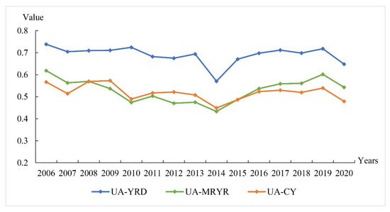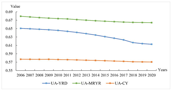 Meanwhile, it is worth noting that the UA-YRD showed the most substantial decline among the three urban agglomerations, with its ULEE falling from 0.738 to 0.648. The UA-CY came second, its ULEE declining from 0.567 to 0.479, while the ULEE of the UA-MRYR had the smallest decline, decreasing from 0.618 to 0.542.