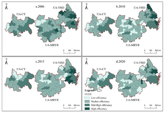 According to the results of the ULEE calculations and referring to the research results of Xia Cong [48] et al., the efficiency values were classified into four levels, i.e., low efficiency (≤0.400), median efficiency (0.400~0.650), mid-high efficiency (0.650~0.900), and high efficiency (≥0.900). Furthermore, four particular years, 2006, 2010, 2015, and 2020, were used as time points to explore the evolutionary characteristics of the spatial heterogeneity of ULEE in the three major urban agglomerations. As shown in Figure 4, the ULEE of UA-YRD was higher than the results for the UA-MRYR and UA-CY, in the central and western parts of the country. The ULEE of UA-YRD was generally at the mid-high efficiency level during the study period, while the UA-MRYR and the UA-CY were at median efficiency.