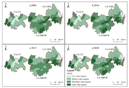 The ecosystem services in the study area were classified into four classes, based on the AESV calculation results using the natural breakpoint grading method; low-value zone (≤0.500), median-value zone (0.500~0.650), mid-high value zone (0.650~0.750), and high-value zone (≥0.750). Again, four separate years, 2006, 2010, 2015 and 2020, were used as time points to explore the evolutionary characteristics of spatial heterogeneity of AESV in the three major urban agglomerations. As shown in Figure 6, the UA-MRYR had higher AESV than did the UA-YRD in the east or the UA-CY in the west. During the study period, the UA-MRYR was generally in the mid-high value zone, while the UA-YRD and the UA-CY were in the median value zone.