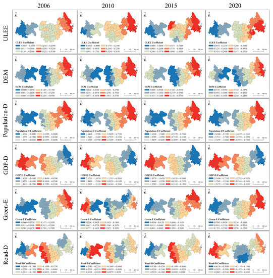As presented in Figure 7, ULEE was found to have a significant positive influence on ESs, consistent with the OLS analysis results. Its influence exhibited a general decreasing spatial trend from east to west, i.e., UA-YRD > UA-MRYR > UA-CY. This spatial pattern did not change greatly within the given study period. As the ULEE increased, considerable improvements in the AESV were observed in the UA-YRD, some progress in the UA-MRYR, and very little in the UA-CY.