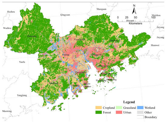 For ecosystem type classification, land use and land cover (LULC) data from 2000 and 2015, with a spatial resolution of 30 m, was collected by the Resources and Environmental Scientific Data Center (RESDC) of the Chinese Academy of Sciences (CAS) (https://www.resdc.cn/) accessed on 15 May 2020. In this study, six main ecosystem types (Cropland, Urban, Forest, Grassland, Wetland, and Other) were further classified corresponding to twenty-one LULC types in the GBA in preparation for ES assessment (Table 2). Table 2 showed the ecosystem type classification.