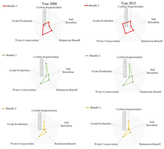 Taking 2000 as the base year and combining land use changes, the spatial–temporal pattern evolution of ESBs in 2015 after fifteen years of rapid urbanization was analyzed. As shown in Figure 3, three more stable ESBs were formed from 2000 to 2015. ESB 1 of ES had a relatively high supply of grain production and low supply of carbon sequestration service. ESB 2 had a high carbon sequestration supply and a low grain production supply, while the supply of all of the ES in ESB 3 are all relatively low. Compared with 2000, the grain production supply of ESB 1 has increased, while the supply for water conservation service has decreased. ESB 2 remained largely unchanged. The supply for carbon sequestration service in ESB 3 was further reduced.